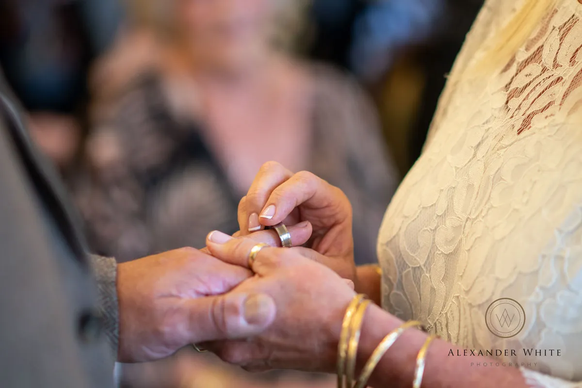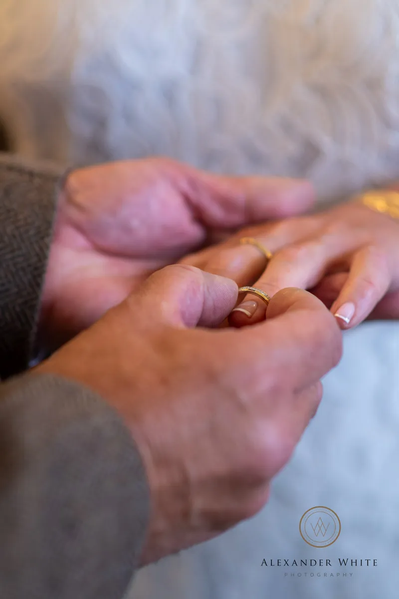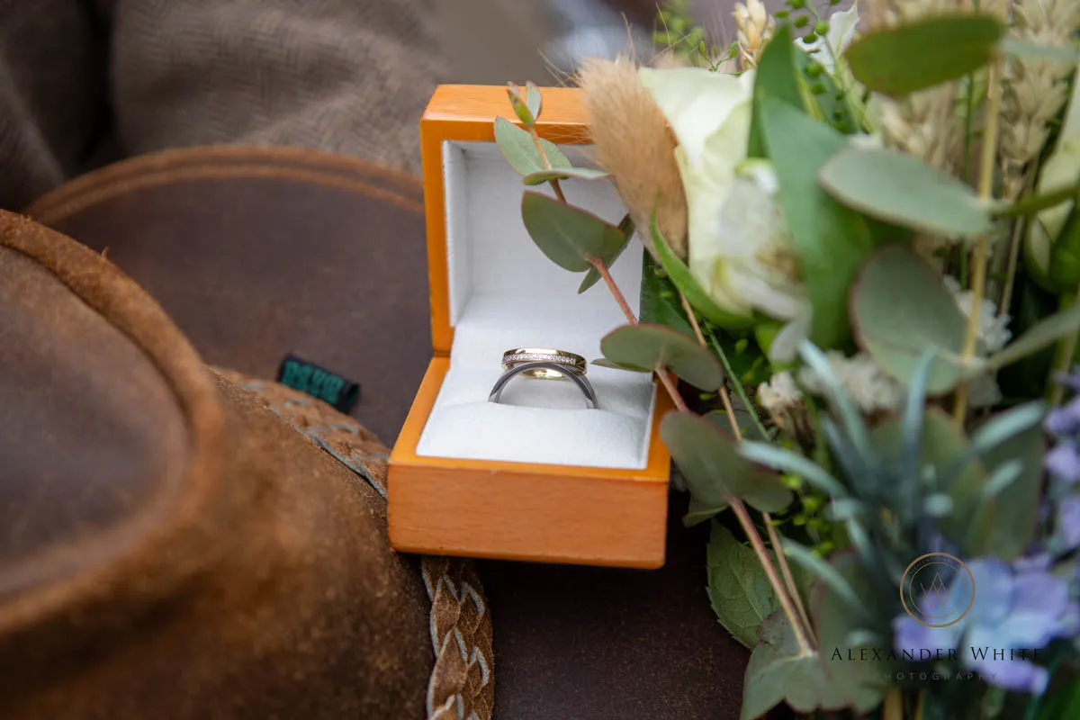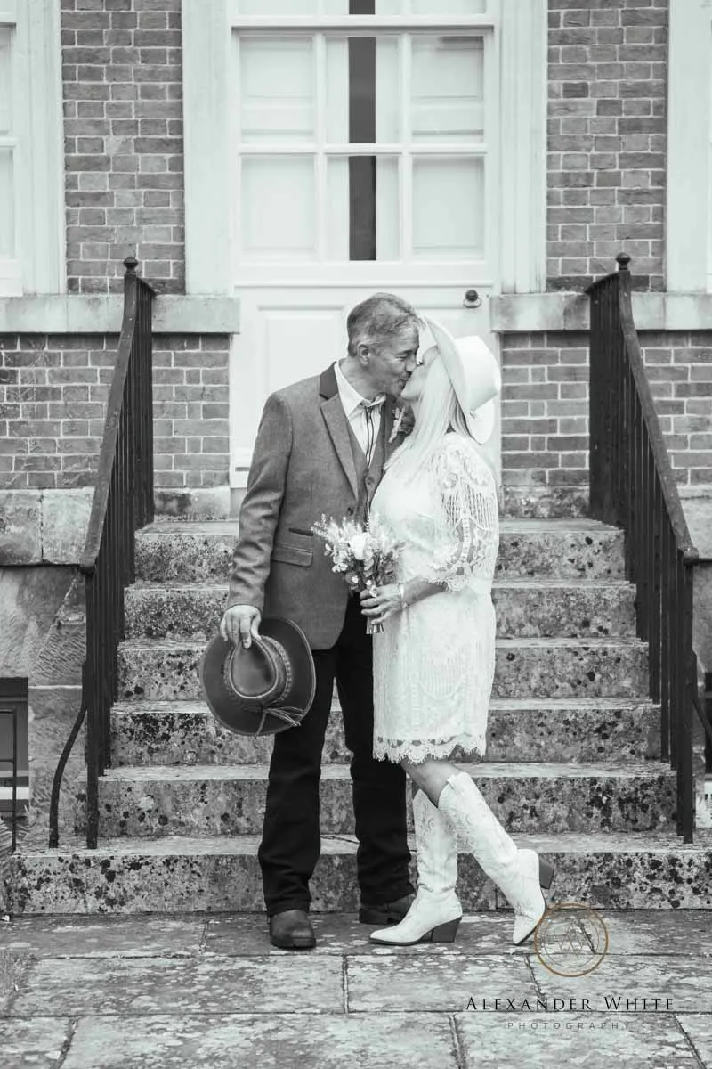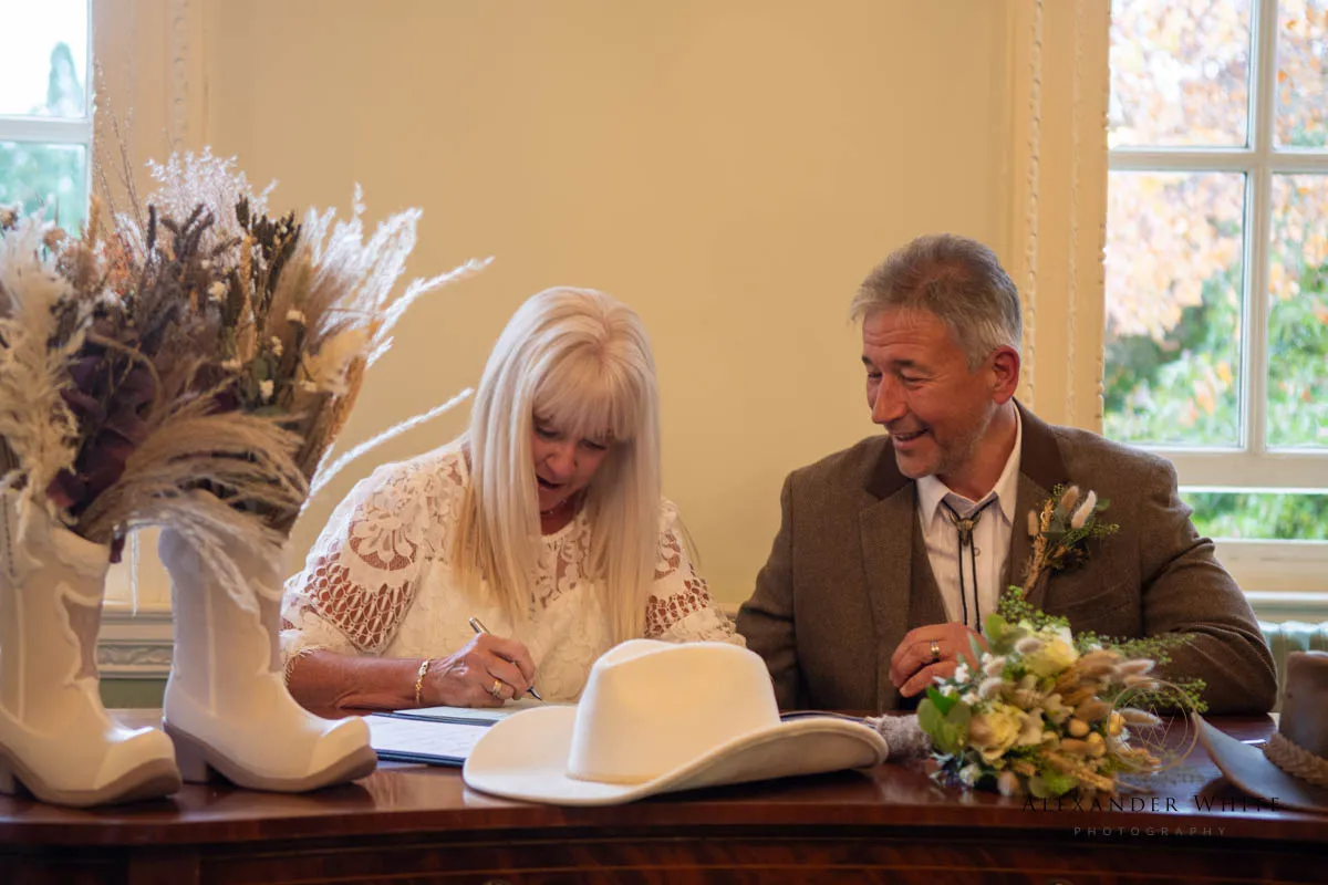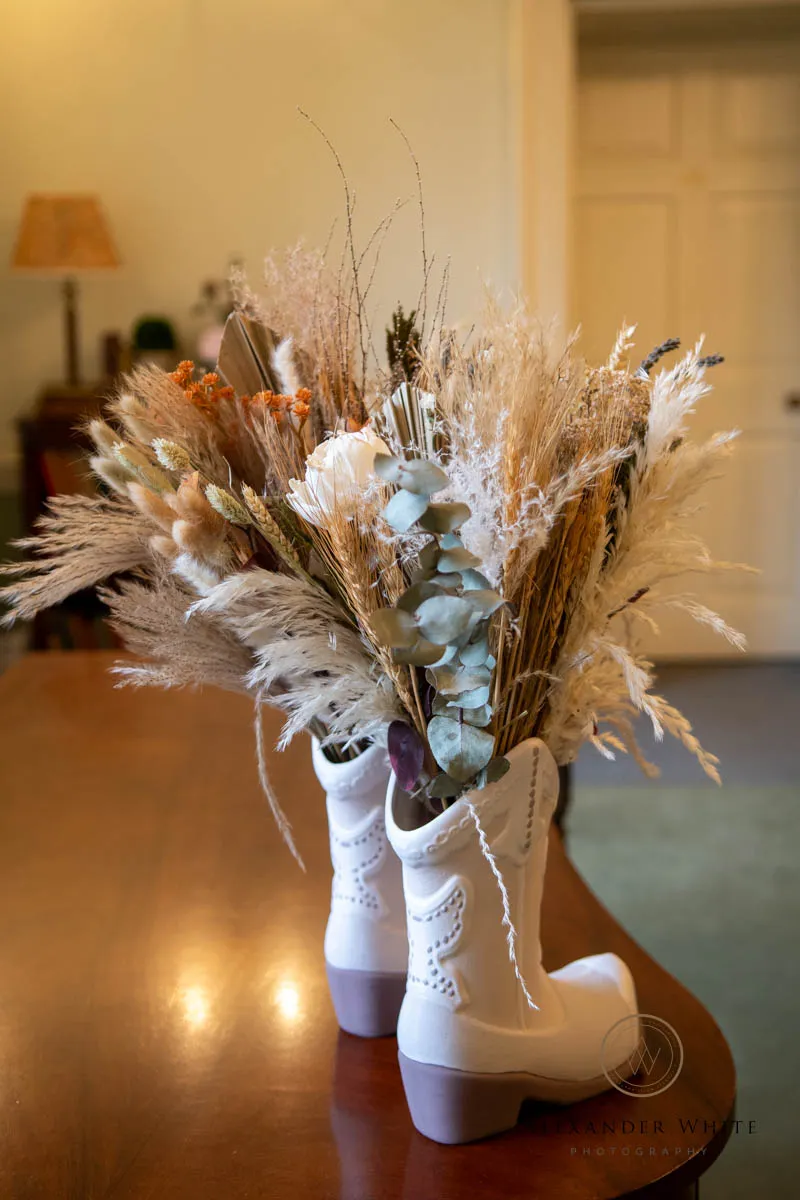 The attention to detail throughout the day was fantastic and made for some brilliant wedding photographs. Instead of traditional floral arrangements, the ceremony room featured flowers displayed in white cowboy boots on the registry office table — a playful and personal touch that immediately set the tone.