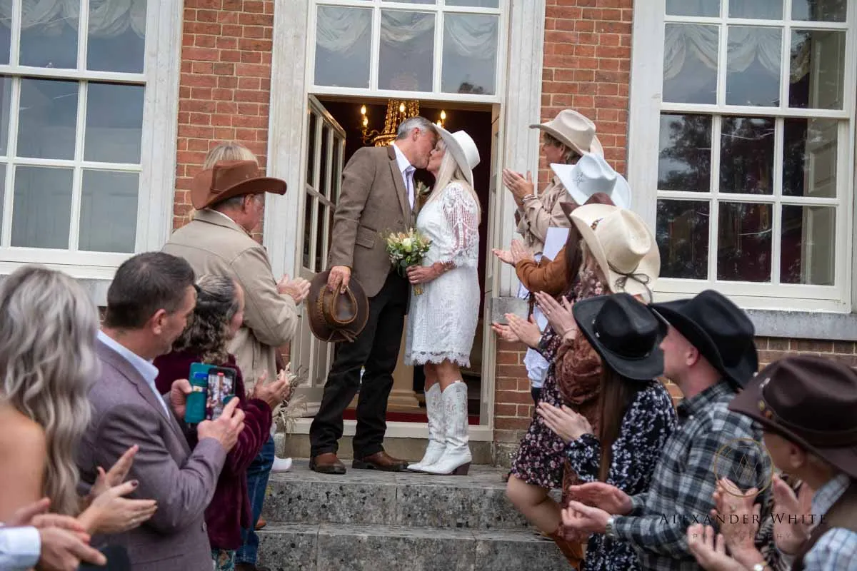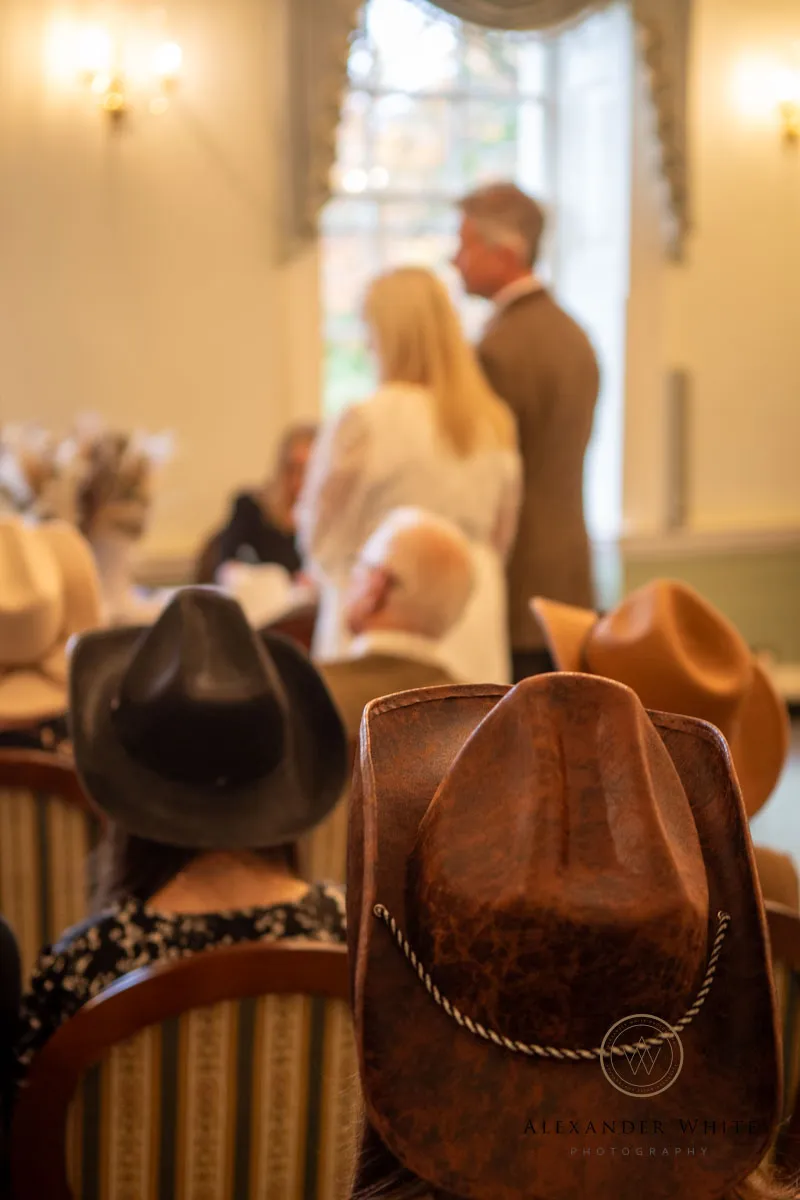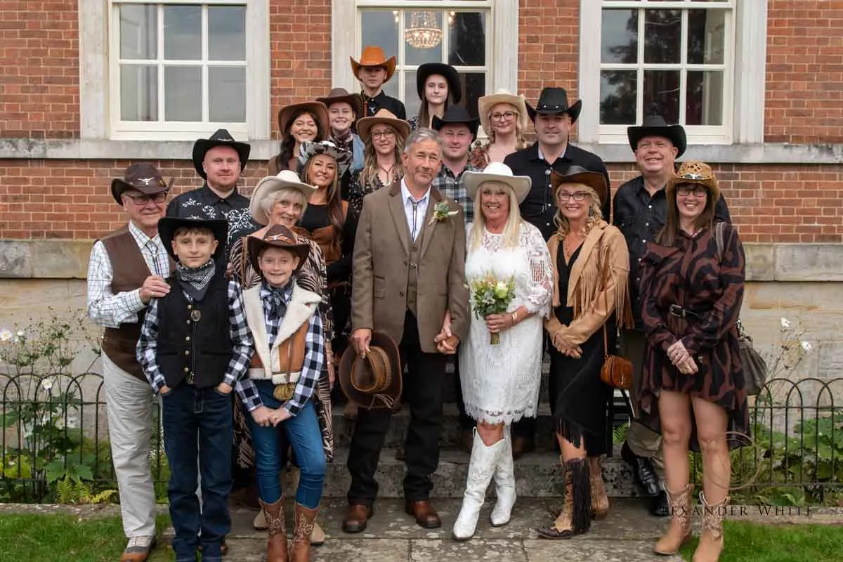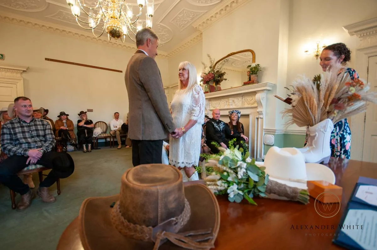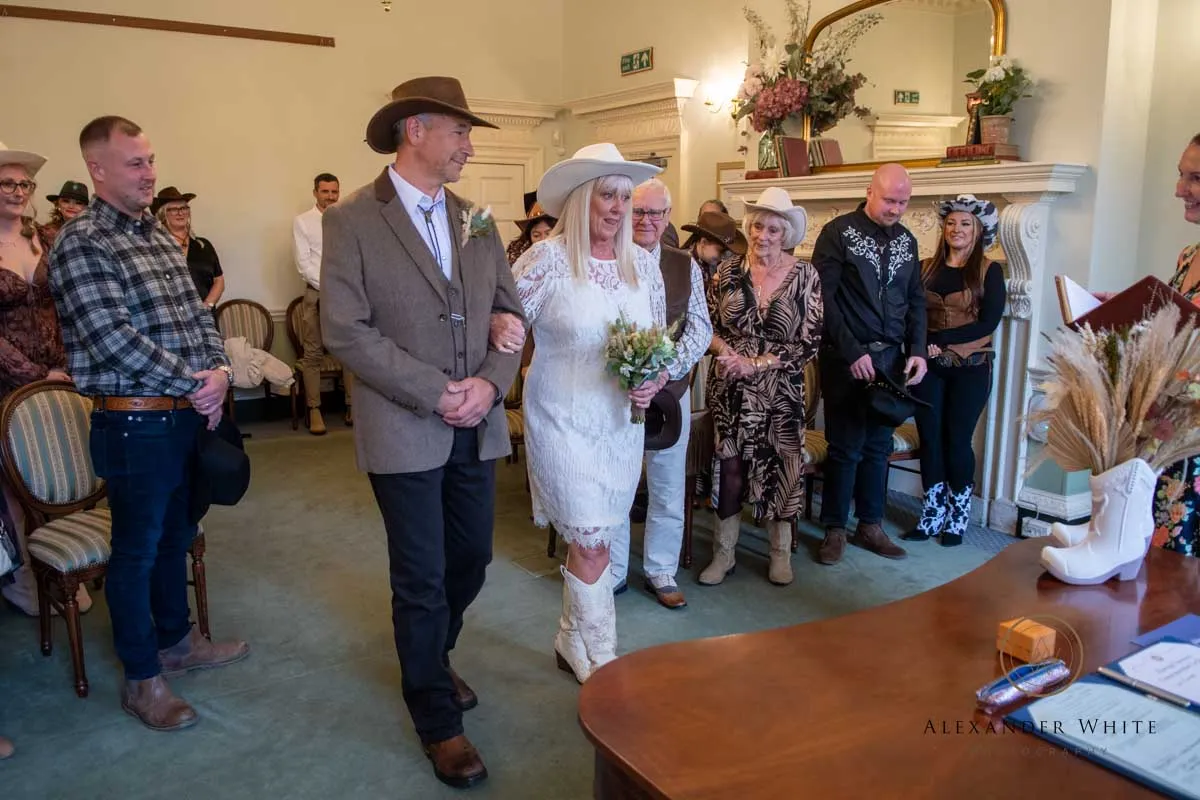 this was no ordinary registry office wedding. With a full-on country and western theme wedding, the bride, groom and their guests fully embraced the spirit of the day — cowboy hats, boots, and all.