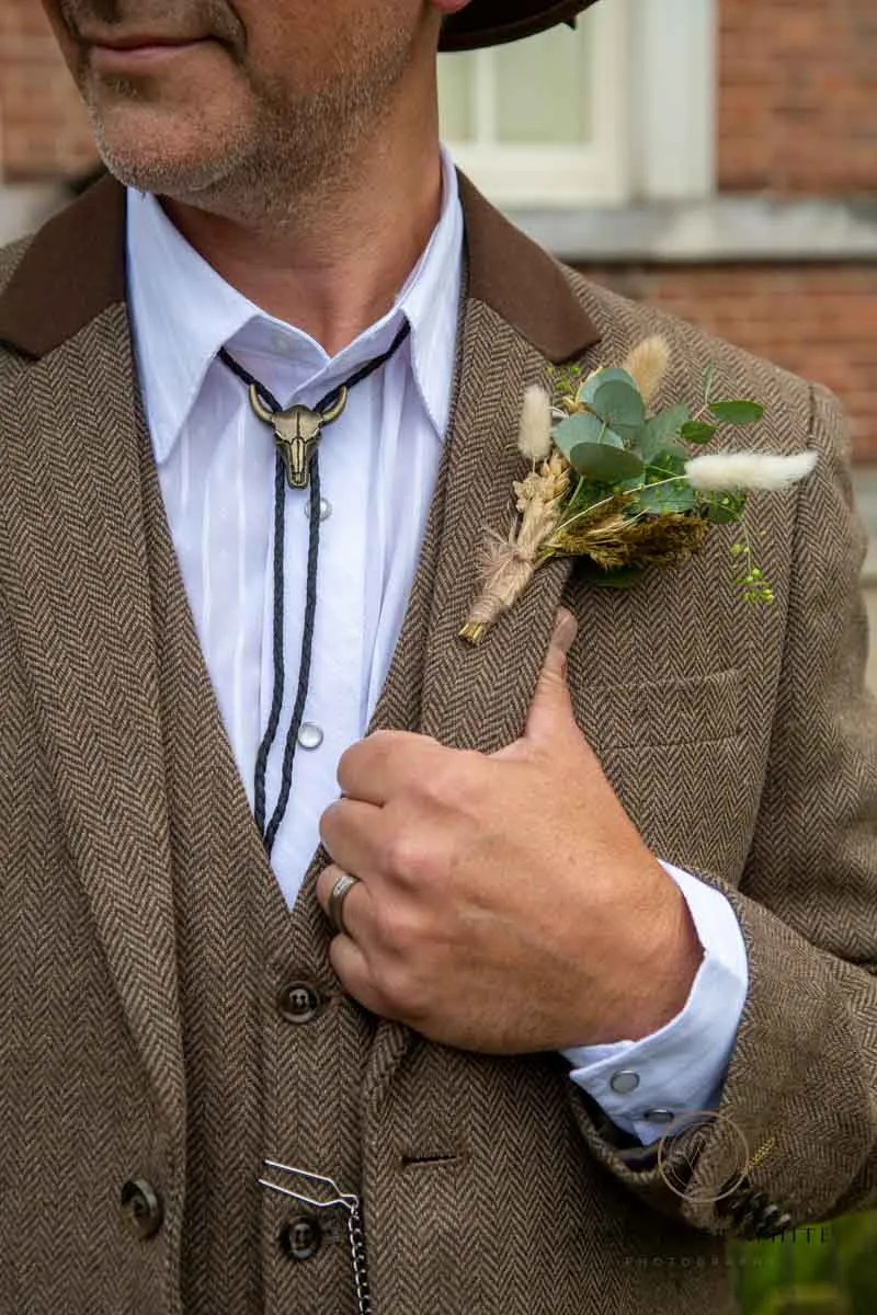 The groom looked equally dapper in a tweed jacket, finished with a striking cow head bolo tie, perfectly balancing the western theme with a relaxed but stylish feel.