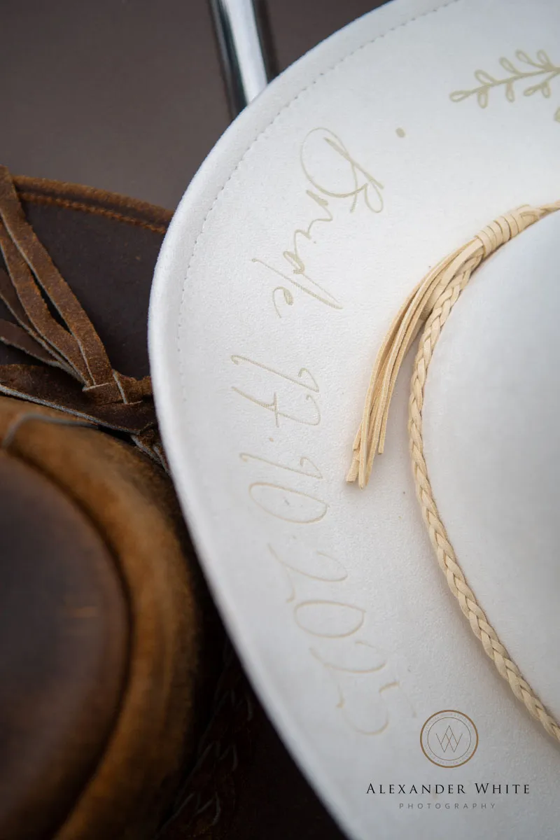 The bride looked incredible in a white, knee-length lace dress, paired with white cowboy boots and a matching cowboy hat. The hat had been specially made for the occasion, with the wedding date etched into the rim — a subtle but meaningful detail that made it even more special.